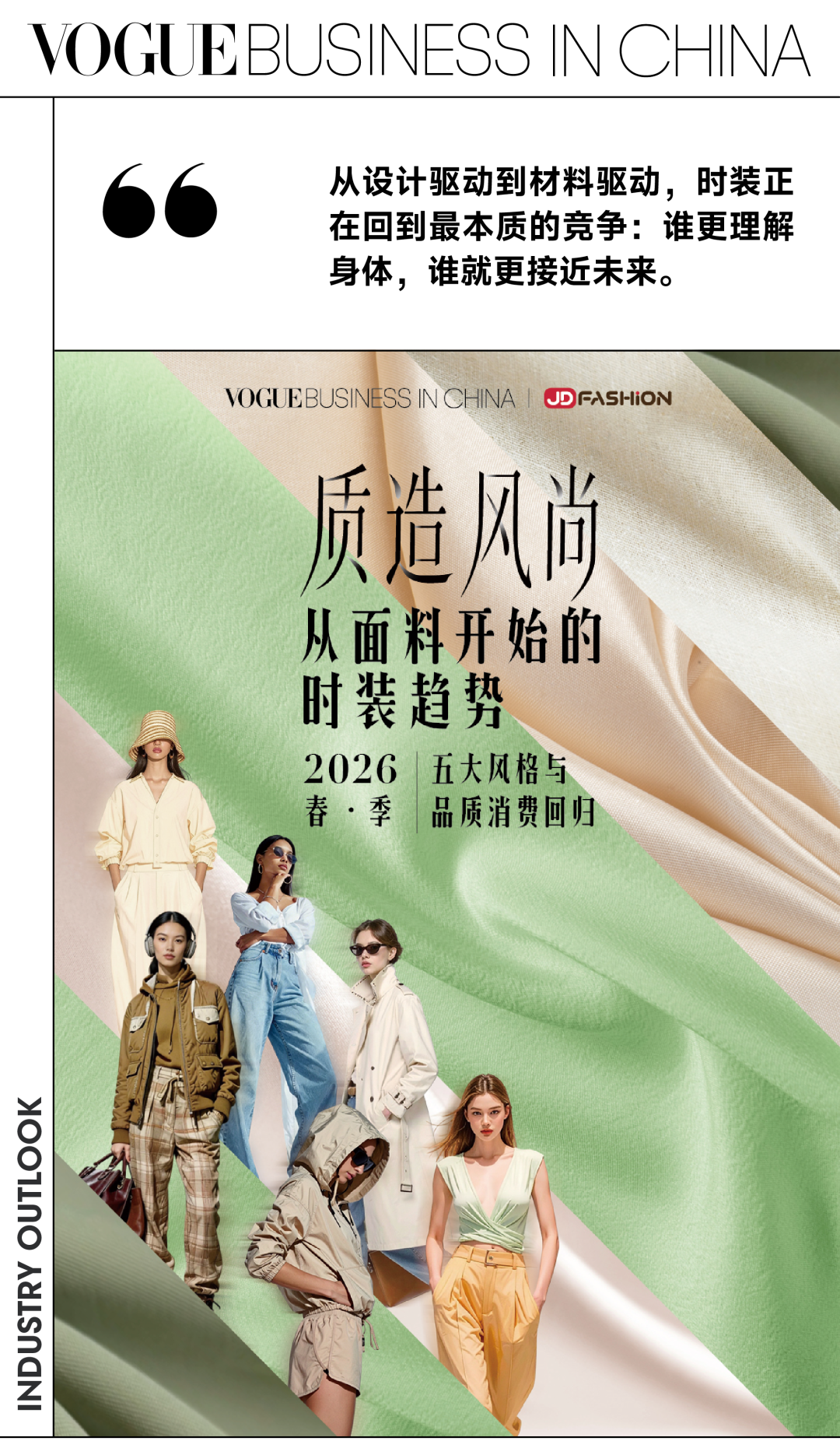 每一季时装周,设计师都会通过廓形、色彩与设计细节,勾勒下一季的时尚风向。但在 2026 春季趋势背后,另一个更深层的变化正在浮现:面料。 长期以来,面料往往被视为设计表达背后的基础要素,而非趋势本身。但随着消费环境趋于理性,消费者开始更加关注面料质感、功能体验与穿着舒适度。材料也因此从幕后走向台前,逐渐成为影响消费决策与趋势形成的重要起点。 今年中国国际时装周,京东服饰联合 VOGUE Business 发布《2026 春季服装面料趋势》,基于消费数据与中国消费者行为分析,试图从材料维度,重新理解下一季服装趋势的演变方向。 报告发现,在理性消费的驱动下,面料的重要性正在被重新定义,并逐渐形成五种具有代表性的面料质感趋势。它们既构成了 2026 春季的风格基础,也映射出中国服装市场从潮流驱动向品质消费的深层转变。 市场变局:品质回归与消费理性化 一件衣服最基础的价值正在被重新审视:它使用什么面料?是否舒适耐穿?具备哪些功能属性? 这些问题,正在成为当下中国服装消费市场的重要议题。与之相对应,品牌的产品逻辑也在发生转变。比起单纯依赖每季的款式更新,越来越多品牌开始从面料出发构建产品差异化。而要理解这一转向背后的驱动力,以及 2026 春季服装市场可能出现的新机会,需要先从宏观消费环境的变化出发。 过去十多年,中国服装市场长期处于规模扩张阶段。消费者更容易受到潮流更新与价格促销的驱动,服装消费呈现出明显的高频更新特征。 但随着整体消费环境逐渐趋于理性,消费者的购买逻辑也开始从 “买得多” 转向 “买得好” 。在服装品类中,这种消费逻辑的变化首先体现在材料层面。产品的材料价值与体感体验,正在重新成为消费者关注的重点。 京东 JoyAgent 洞察数据显示,2024 年至 2026 年间,多类与材料属性与穿着体验相关的面料关键词搜索热度持续上升。其中,凉感科技面料(如莱赛尔)成为增长最快的面料类型之一;天然亲肤面料(棉、麻)、功能防护面料(三防、防晒)、光泽质感面料(醋酸、真丝)则保持稳定增长,显示出消费者对高品质基础材料的关注稳步提升。 图片来源:京东服饰、VOGUE Business 进一步观察材料关注度的变化可以发现,消费者对面料的关注重点也正在发生明显迁移。基于京东 JoyAgent 对全网搜索趋势与社交媒体提及率的综合分析与预测模型,从 2024 年至 2026 年的趋势变化来看,传统材料的关注度整体保持稳定,但增长相对有限。例如,普通纯棉、普通聚酯纤维的搜索热度指数逐步下降,消费者对于基础材料的关注度正在逐渐减弱。 与此同时,两类新型材料的关注度正在快速提升。一类是具备凉感或发热属性的功能性混纺面料,成为增长最快的材料类型;另一类则是生物基面料与再生材料为主的可持续材质,以及高端丝麻类材料。这表明消费者对服装的需求,正在从单纯的外观与款式,转向更具实际使用价值的功能体验,同时也开始更加重视材料背后的可持续属性。 从整体趋势来看,随着消费者越来越关注产品本身的长期价值,包括面料品质、穿着体验、功能属性与环保理念等方面,服装行业的竞争逻辑也正在从过去以规模扩张和潮流驱动为主,逐渐转向以材料与产品价值为核心的结构升级阶段。 在整体消费环境趋于理性的背景下,消费者的购买决策正在发生明显变化。相比过去更容易被价格与潮流驱动,如今消费者在选择服装时,更倾向于在质量、功能性与实际使用价值之间进行综合判断。VOGUE Business 近年来的一系列消费者研究显示,随着价格上涨与市场不确定性增加,消费者对产品 “质价比” 的关注度持续提升。这一以长期价值为导向的判断标准,在年轻消费群体中表现得尤为明显。 基于京东 JoyAgent 2025—2026 年 Z 世代消费者画像的分析显示,“舒适亲肤” “功能性” 以及 “环保与品牌伦理” 等因素在消费决策中的权重明显提升。其中,“功能性”(如免烫、防水等)成为增长最显著的因素。相比之下, “基础保暖” 与单纯依赖款式设计的购买驱动力则有所下降。 图片来源:京东服饰、VOGUE Business 对于新一代消费者而言,一件衣服不仅要好看,还要穿得舒适、具备实际功能,并能够长期使用。与此同时,消费者也正在用实际消费行为,将购买选择投向那些真正 “值得长期穿着” 的产品。京东消费数据显示,高品质基础款持续增长,功能型服饰需求不断上升,同时天然纤维材料的关注度也在明显提升。 随着消费者对材料价值的重视程度提高,面料升级也正在推动服装市场的价格结构发生变化。从 2025—2026 年面料升级驱动的价格带增长来看,增长最明显的区间集中在中高价格带。这也进一步表明,消费者正更加理性地重新分配消费预算。对于缺乏品质支撑的低价产品,购买意愿趋于谨慎;但对于能够提供更好材料、功能体验与长期使用价值的产品,则显示出更高的消费意愿。 然而值得关注的是,当消费决策的判断标准从过去由价格驱动的 “性价比” ,逐渐转向更加重视产品品质与长期价值的 “质价比” 消费时,市场供需结构却出现了新的断层。 基于京东 JoyAgent 对站内需求与供给指数的分析,一些围绕材料升级与功能创新的细分面料,已经呈现出明显的 “高需求、低供给” 结构。例如,可机洗羊毛、植物染/零碳面料以及智能调温面料等产品的消费者需求指数,明显高于市场