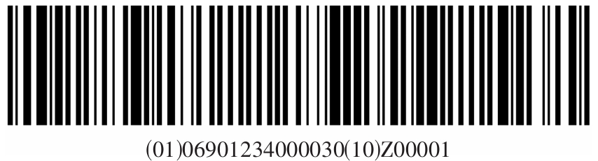 例如,某服装生产企业A购进了一批面料,该企业已申请厂商识别代码“6901234”。针对这批面料,企业为其分配唯一识别代码“(01)06901234000030(10)Z00001”,并采用GS1-128条码进行标识,如图1所示。